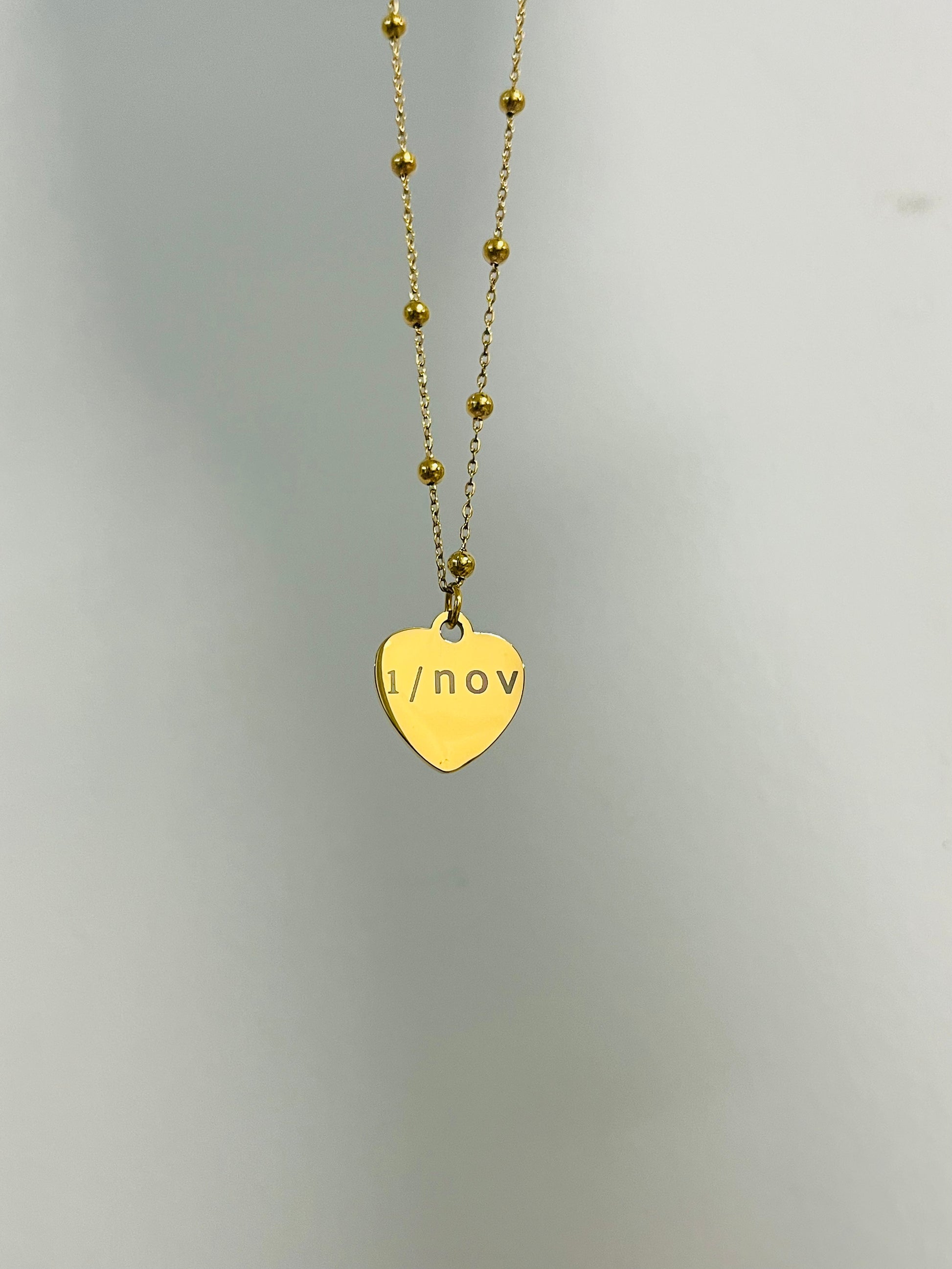 Un delicado collar dorado con un dije en forma de corazón, para plasmar en grabado en láser tu momento especial con fecha e iniciales.