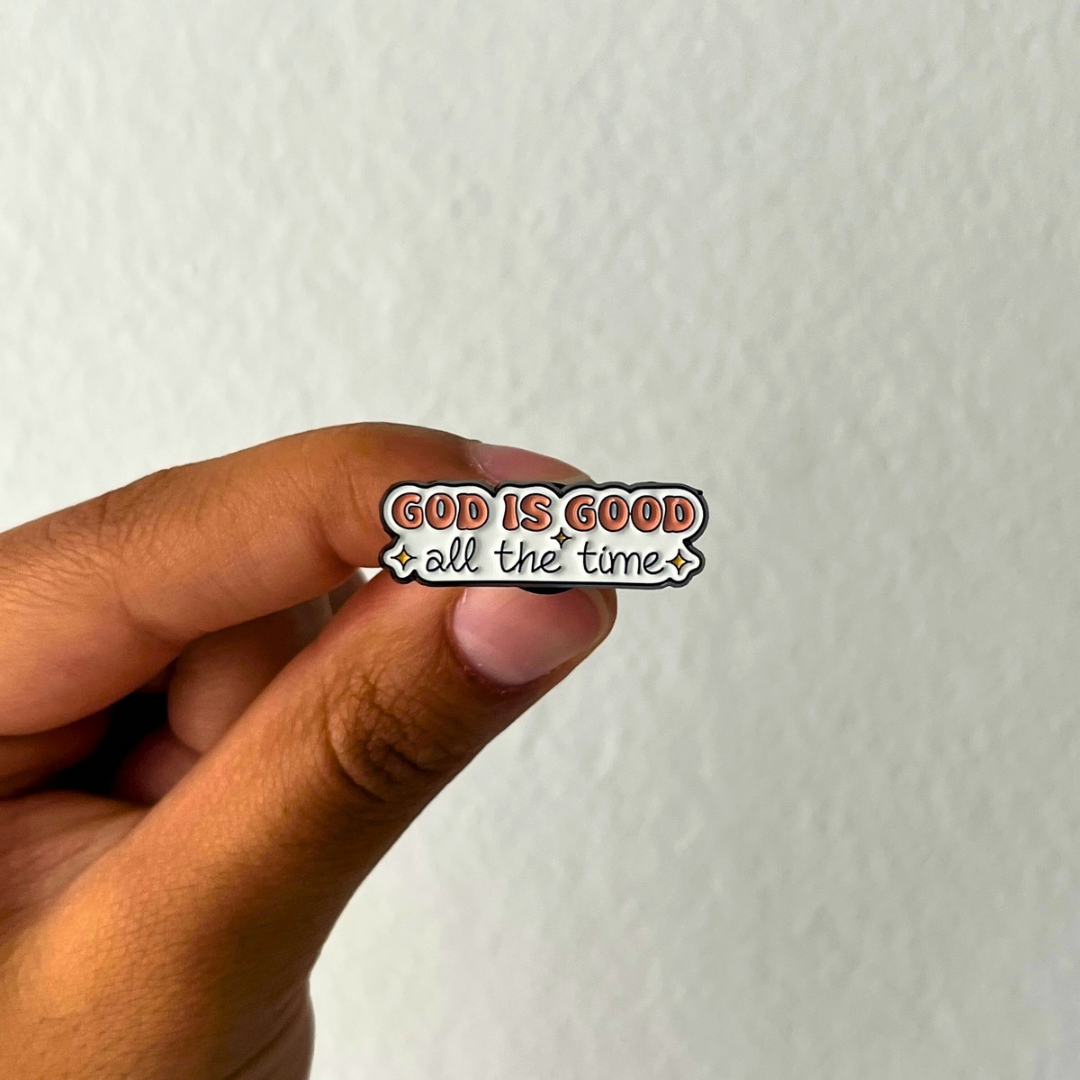 - Añádele un toque a tu mochila, chaqueta o donde prefieras. Este set incluye pines con mensajes edificantes como "GOD IS GOOD" y "BUT FIRST PRAY", diseñados para ser pequeños recordatorios de grandes verdades a lo largo de tu día.